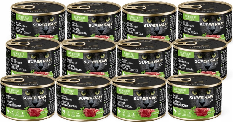Super Rafi Cat z dziczyzną i sercami z kurczaka to pełnoporcjowa karma, która w pełni pokrywa dzienne zapotrzebowanie dorosłych kotów na wszystkie niezbędne składniki odżywcze. Wysoka zawartość mięsa i produktów pochodzenia zwierzęcego (70%), w tym filetu z kurczaka oraz mięsa z dziczyzny i serc, gwarantuje źródło wysokostrawnego białka o wysokiej wartości biologicznej.