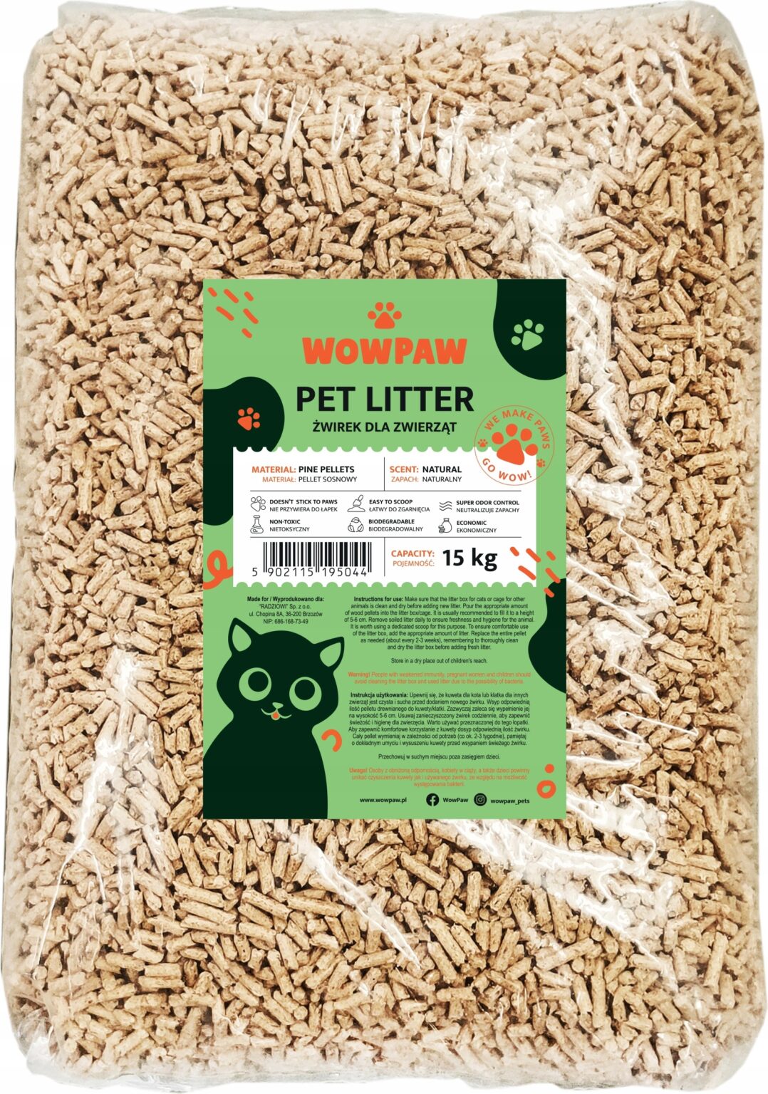 Pellet drewniany WowPaw dla zwierząt domowych to naturalny żwirek wykonany w 100% z drewna sosnowego, który stanowi doskonałą opcję dla właścicieli zwierząt poszukujących ekologicznego produktu.